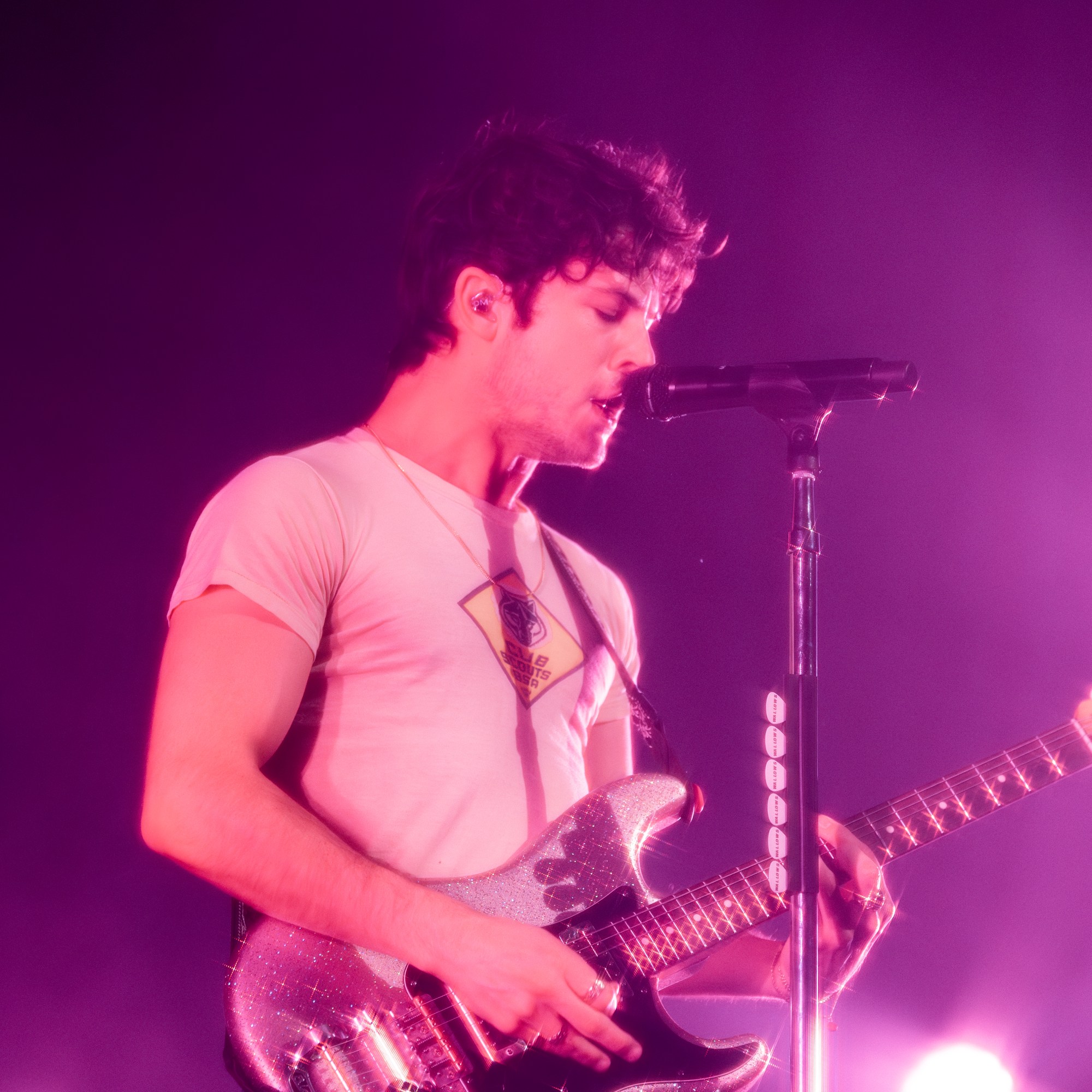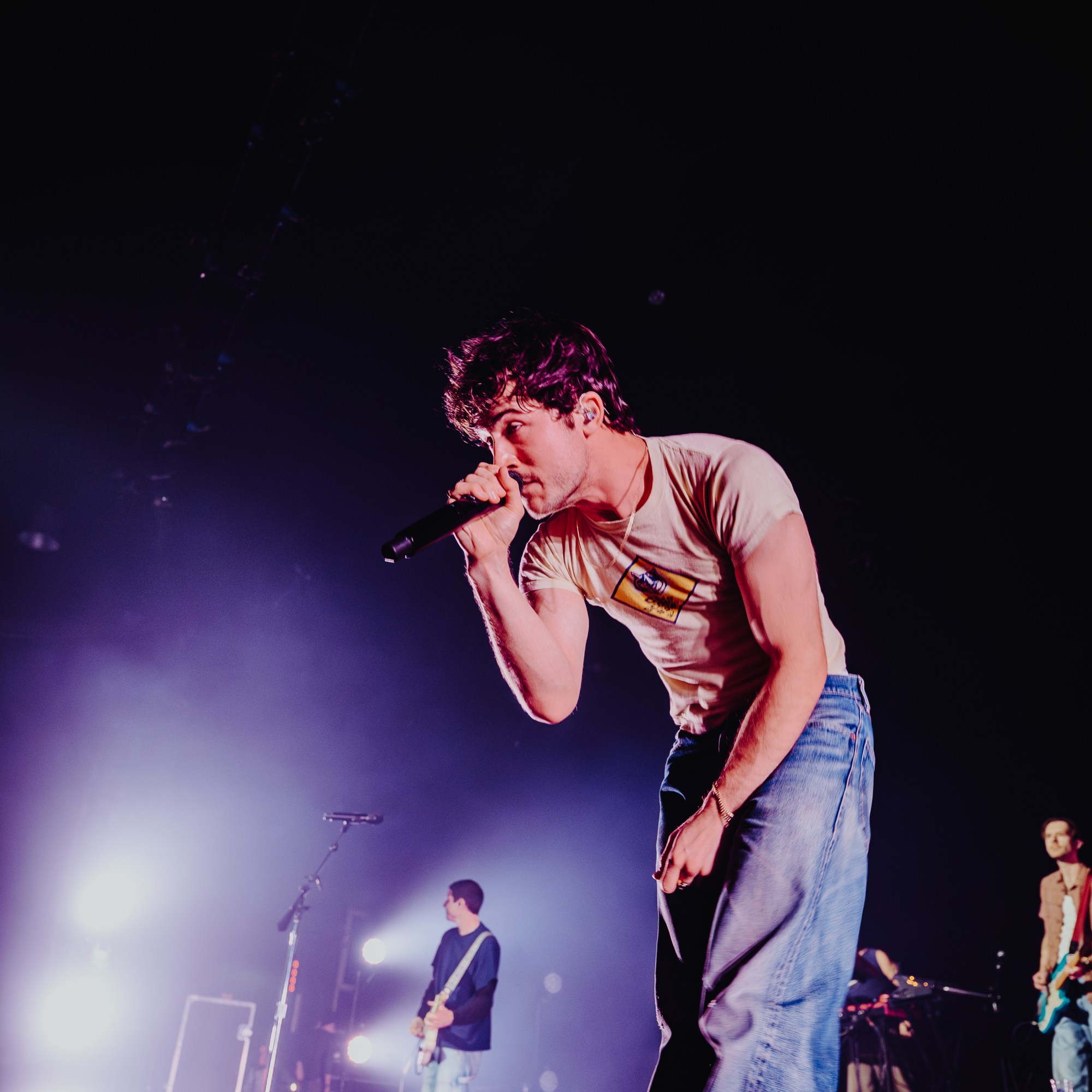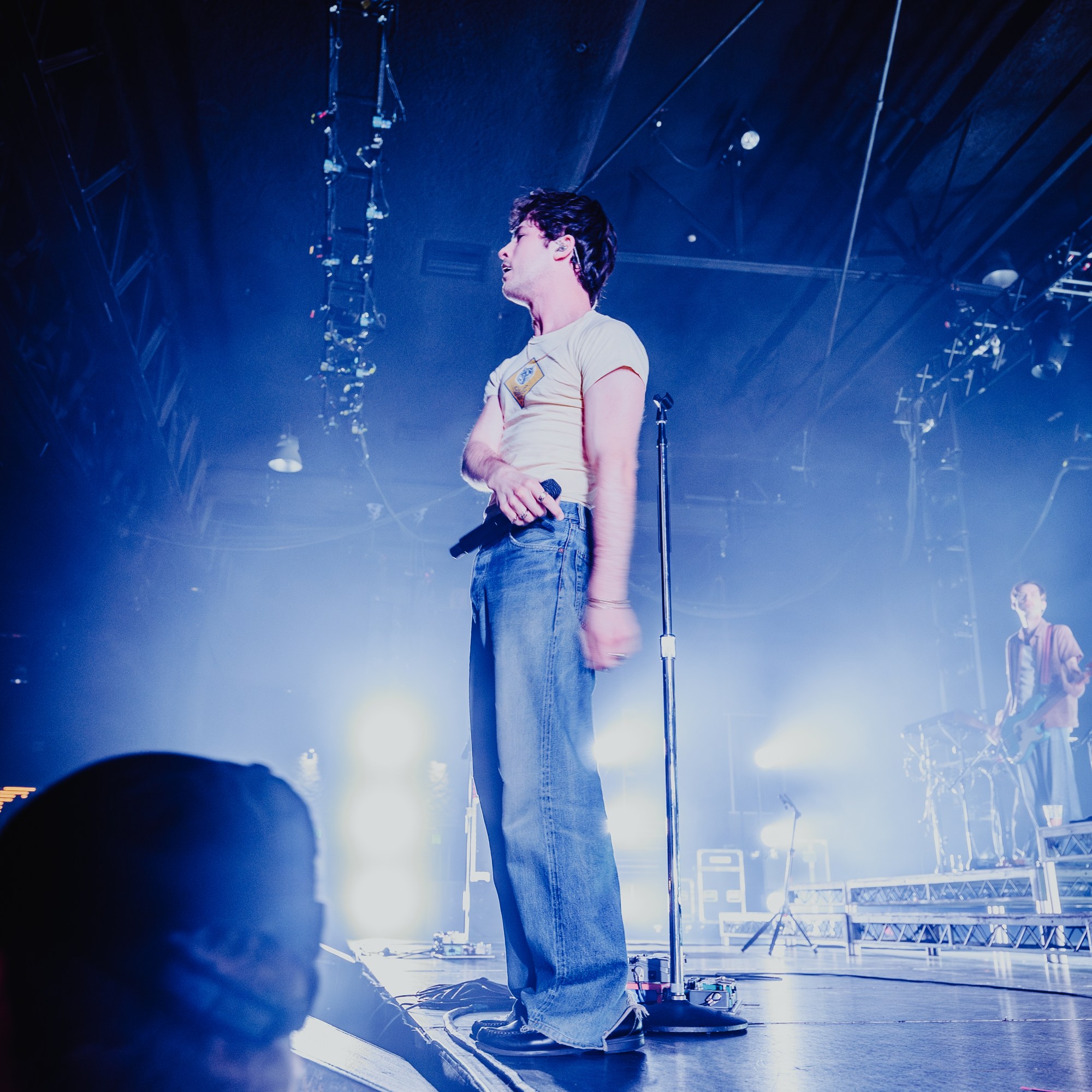 The stage was simply set up with some risers, and a black curtain behind them that lit up with fairy lights during “A Warning”. As they performed “She’s And Actress” Dylan walked through the crowd singing the song until he reached the B-stage at the back of the venue. Theatrically turning on some lamps that were surrounding the living room aesthetic of the b-stage set-up, fellow band members Braeden Lemasters and Cole Preston joined him. Performing stripped back versions of “Pictures Of Girls”, “1980s Horror Film” and “OK”, they gave the audience a different perspective of their artistry as musicians. As Dylan and Cole made their way back to the main stage, Braeden ran around the venue’s seated bleachers sections singing “Worlds Apart”.