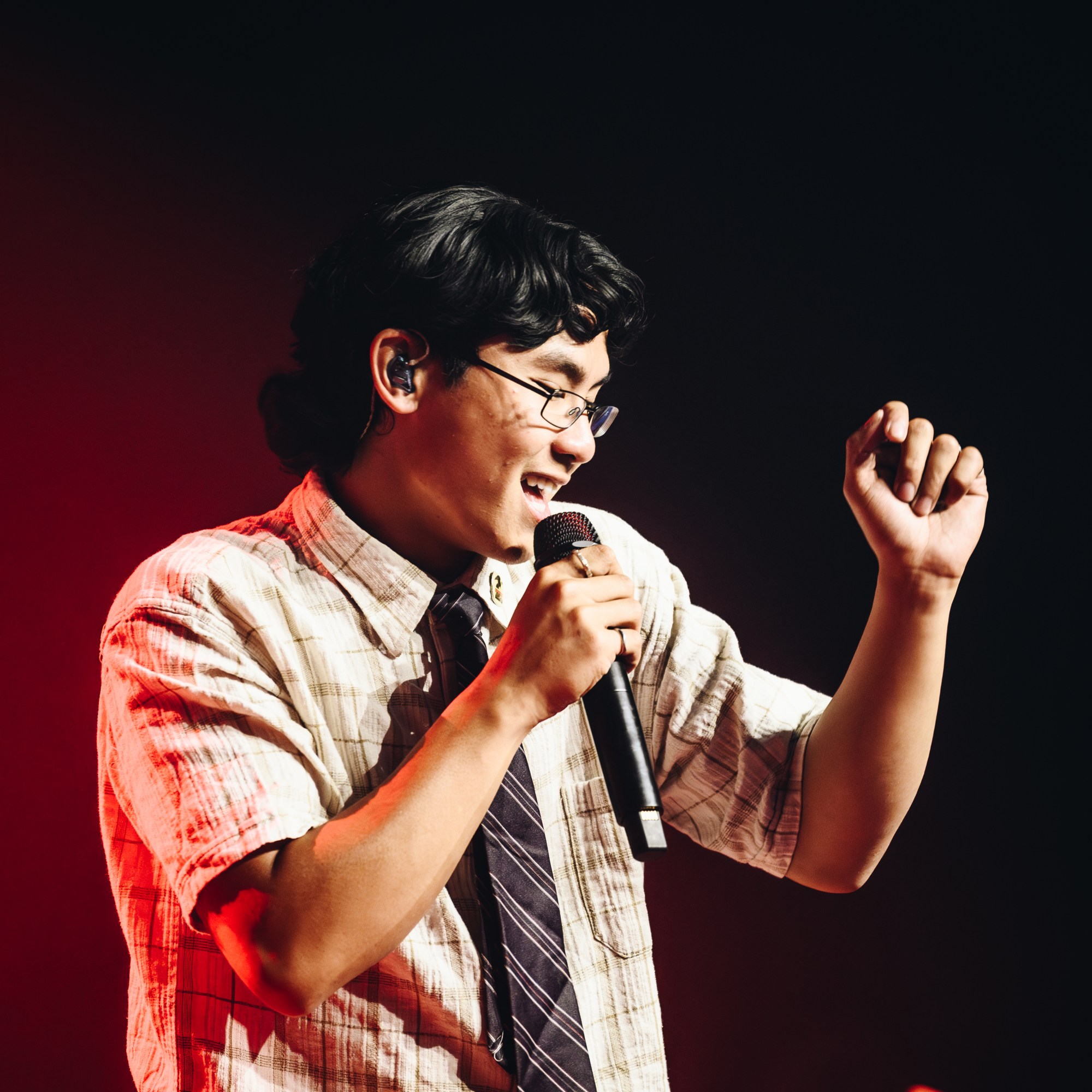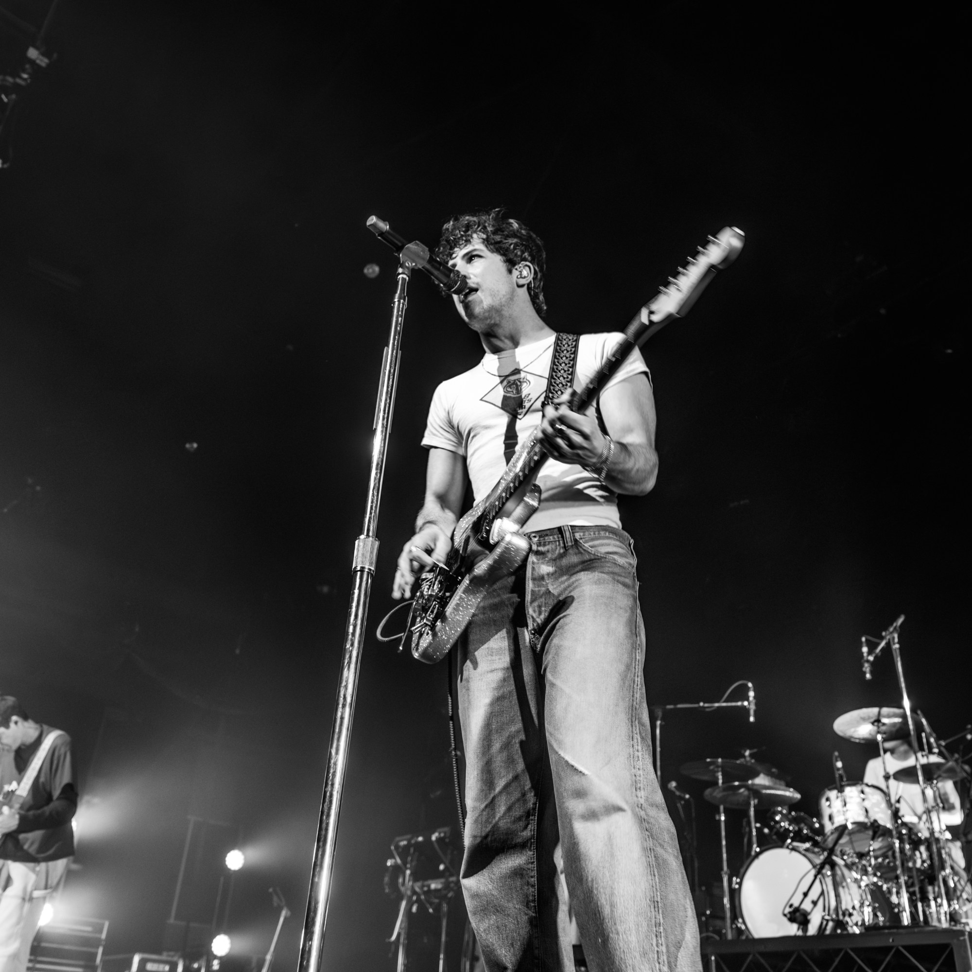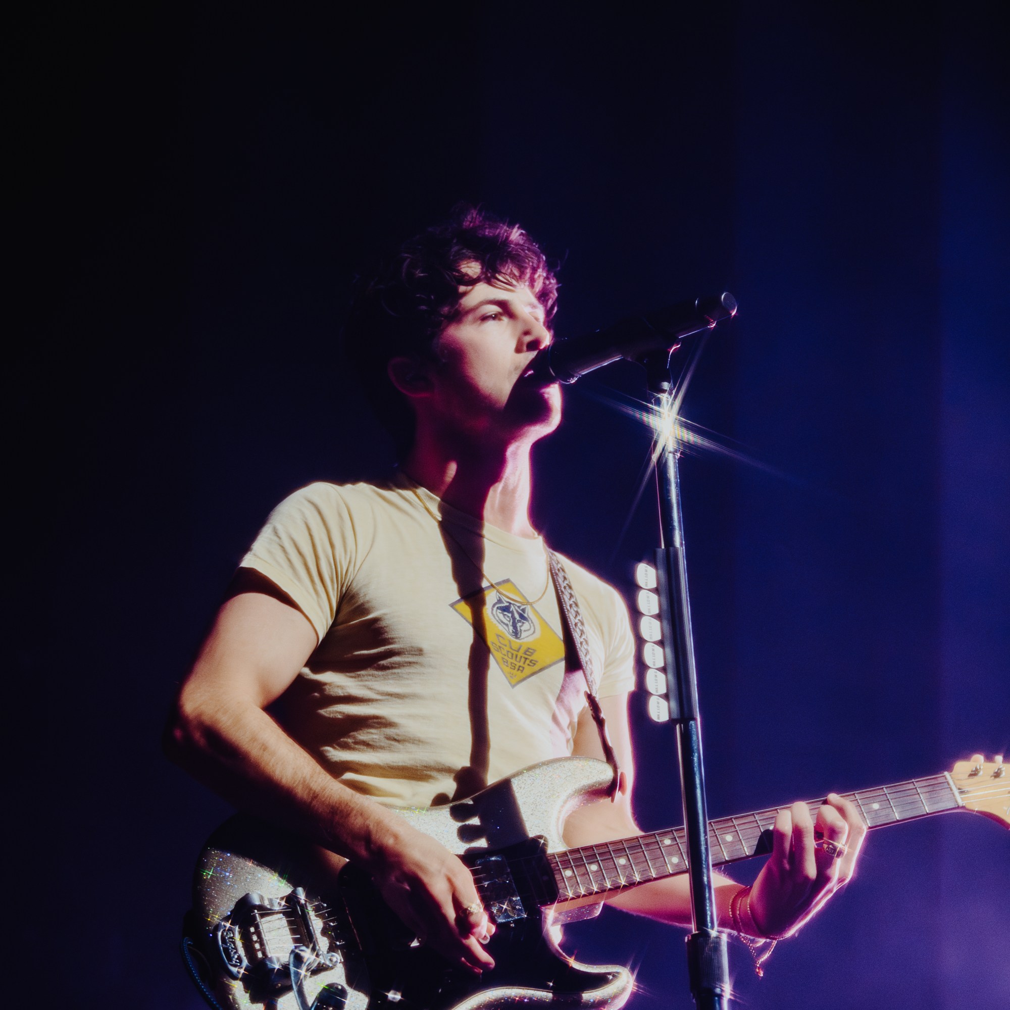The stage was simply set up with some risers, and a black curtain behind them that lit up with fairy lights during “A Warning”. As they performed “She’s And Actress” Dylan walked through the crowd singing the song until he reached the B-stage at the back of the venue. Theatrically turning on some lamps that were surrounding the living room aesthetic of the b-stage set-up, fellow band members Braeden Lemasters and Cole Preston joined him. Performing stripped back versions of “Pictures Of Girls”, “1980s Horror Film” and “OK”, they gave the audience a different perspective of their artistry as musicians. As Dylan and Cole made their way back to the main stage, Braeden ran around the venue’s seated bleachers sections singing “Worlds Apart”.